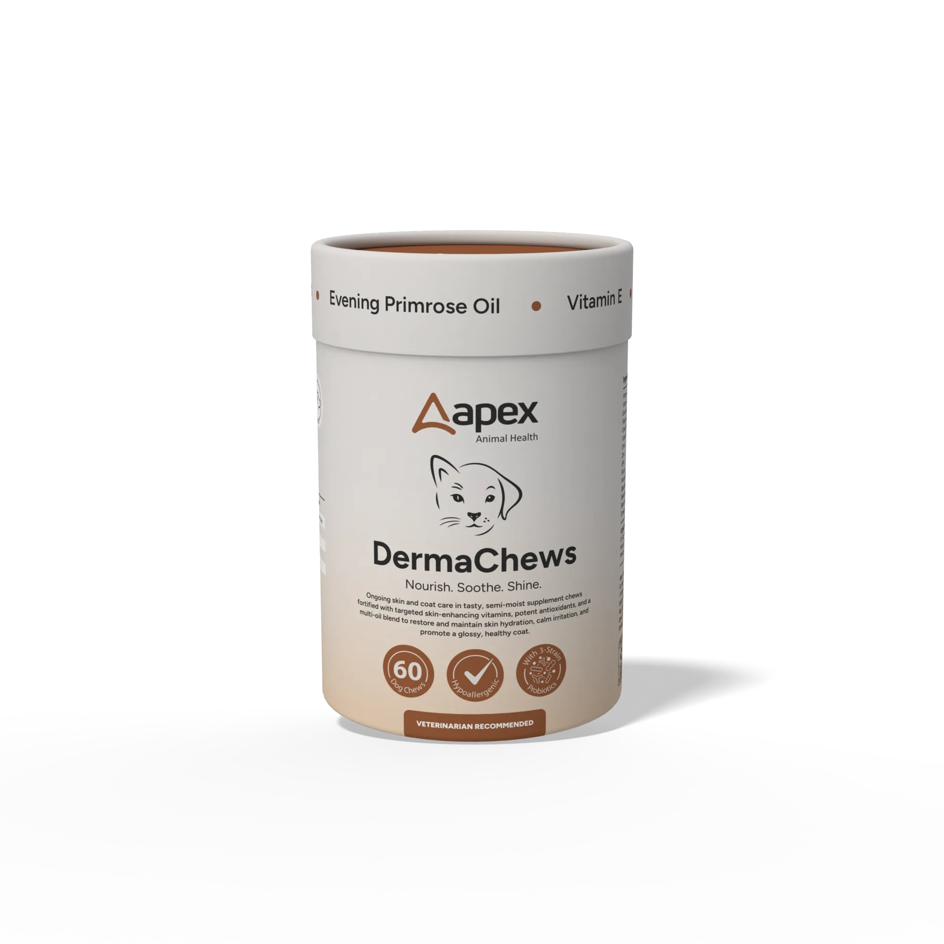 Ongoing skin and coat care in tasty, semi-moist supplement chews fortified with targeted skin-enhancing vitamins, potent antioxidants, and a multi-oil blend to restore and maintain skin hydration, calm irritation, and promote a glossy, healthy coat.