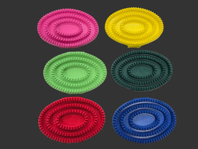 Soft rubber curry comb for cleaning the coat and removing sweat, dirt and excess hair.