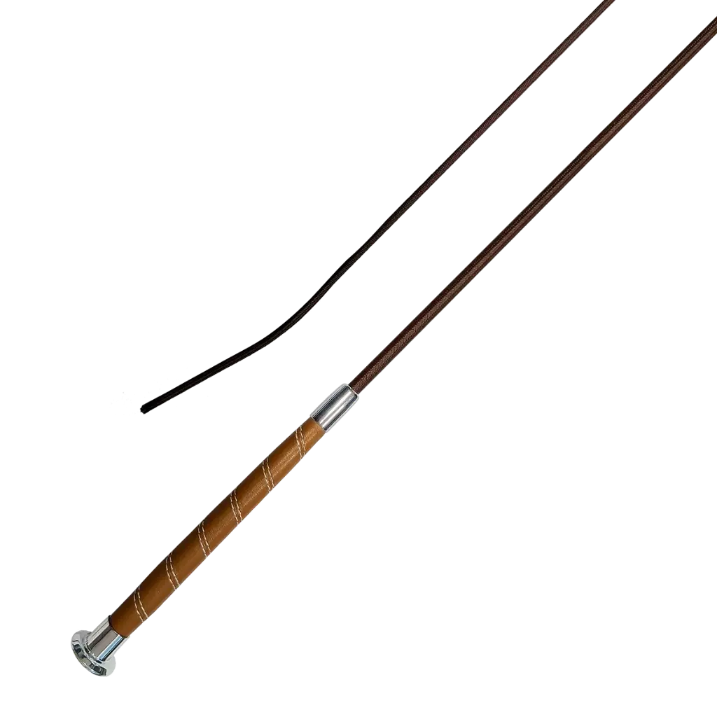 The whip features a smooth leather-look handle finished with contrasting white stitching, providing a comfortable, secure grip and a timeless aesthetic. A silver end popper completes the handle, adding both durability and an elegant finishing touch.