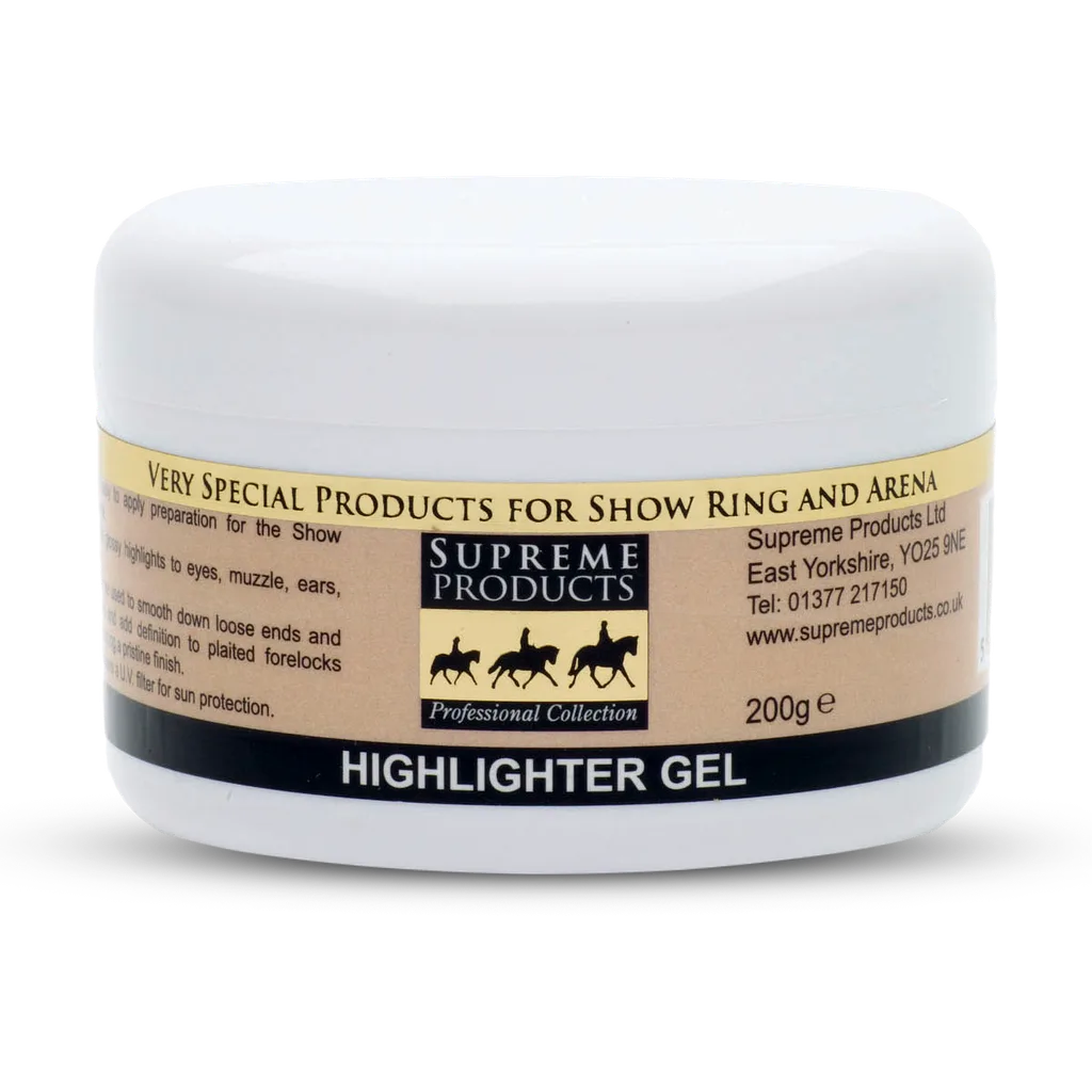 Use Supreme Products Highlighter Gel to enhance eyes, nose and dock, for smoothing down plaits and forelock and for the addition of quarter marks. Tried and tested over the Supreme Products range of make up colours. Contains a UV filter to help prevent sunburn. 200 ml